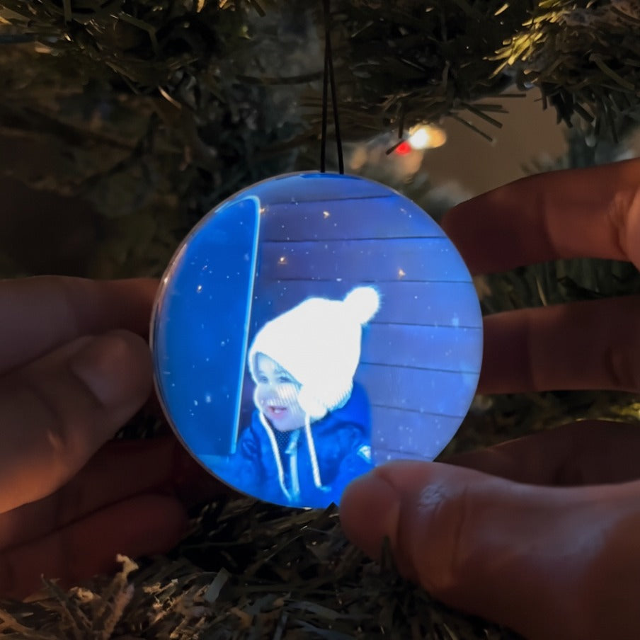 Add a layer of warmth to your holiday. This photo captures the Memory Ball transforming a precious winter moment—a child's bundled up smile—into a glowing ornament. Hanging among the festive lights, your personalized orb brings a unique, heartwarming touch to your Christmas decor. It’s the perfect way to make family memories the centerpiece of your holidays and relive the magic year after year.